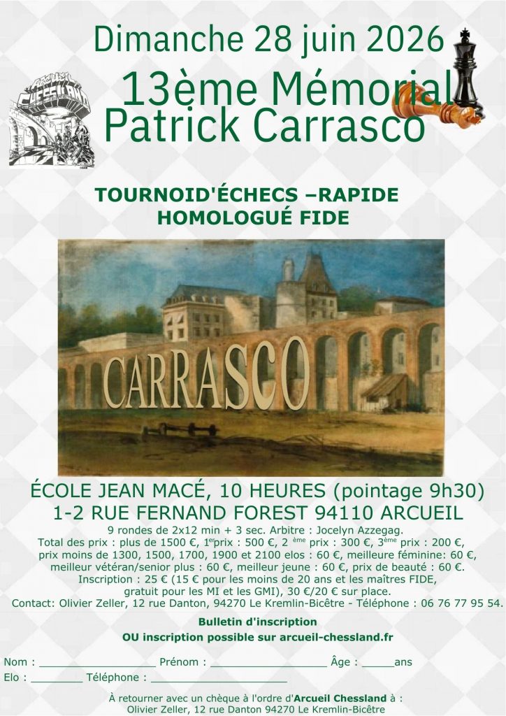 Bienvenue au Mémorial Patrick Carrasco, 13ème du nom ! Ce tournoi s’adresse à des joueurs de tous âges et de tous niveaux et comporte de nombreux prix de catégories, y compris un prix de beauté qui récompense la partie la plus spectaculaire. Pour vous inscrire, vous pouvez utiliser le flyer ci-dessous ou le lien : https://www.billetweb.fr/13eme-memorial-patrick-carrasco
