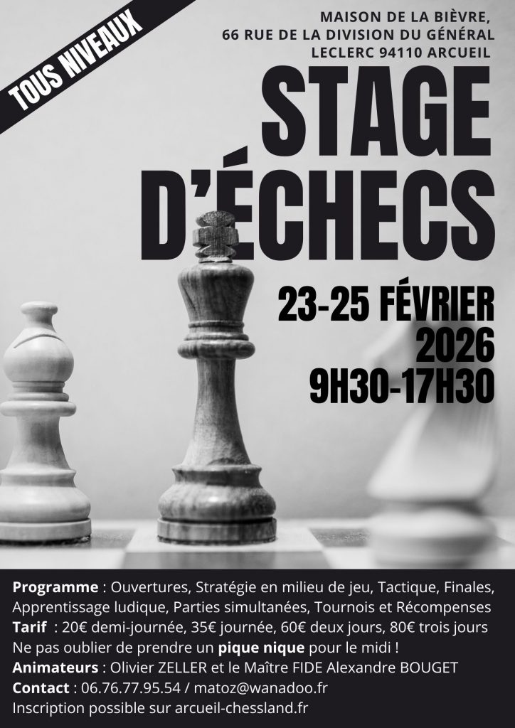 Un stage de trois jours se déroulera à la Maison de la Bièvre du lundi 23 au mercredi 25 février. Cet évènement s’adresse à la fois aux enfants et aux adultes, quels que soient leurs niveaux. L’objectif est de progresser dans tous les compartiments du jeu mais aussi et surtout de passer un agréable moment. Les inscriptions peuvent s’effectuer en ligne via le lien https://www.billetweb.fr/stage-dechecs1&src=agenda